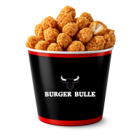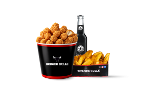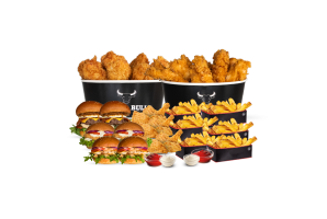 • 18 Hot Wings • 6 Filet Bites • 4 Fried Chicken Buckets • 3 Pommes frites • 4 Saucen nach Wahl