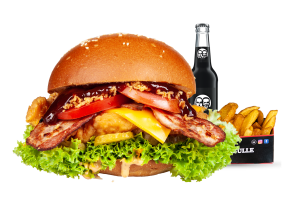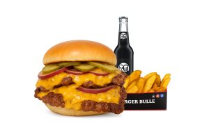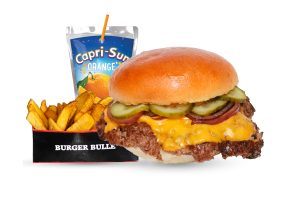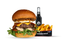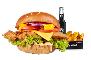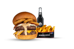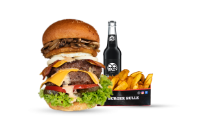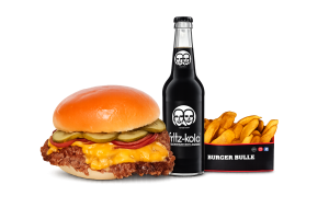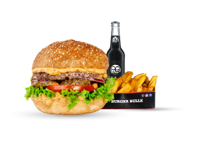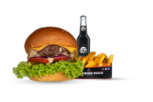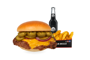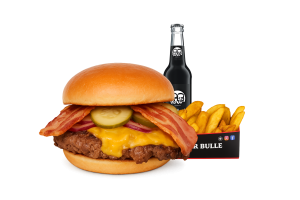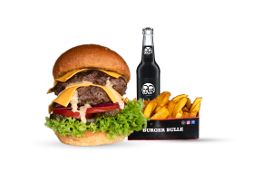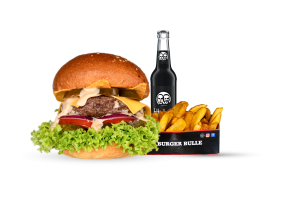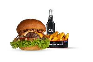 • 1 Cheese Bull Beef Burger • 1 Fries mit Dip nach Wahl • 1 alkoholfreies Getränk 0,33l nach Wahl inkl. Pfand