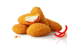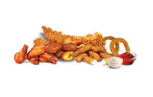 • 2 Hot Wings • 2 Filet Bites • 2 Onion Rings • 2 Chili Cheese Nuggets • 2 Mozzarella Sticks • 2 Red Hot Chili Peppers • 2 Saucen nach Wahl