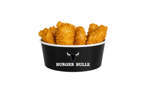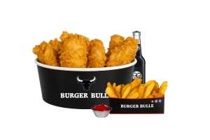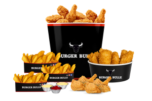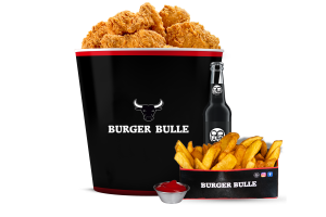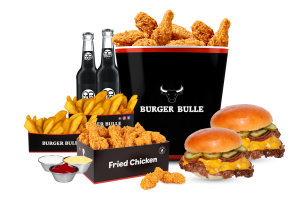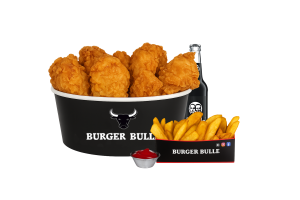 • 12 Hot Wings • 6 Filet Bites • 2 Crispy Chicken Burger • 2 Pommes frites • 3 Saucen nach Wahl