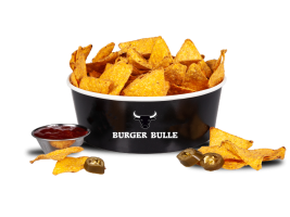 mit Cheddar, Gurken, Salat, roten Zwiebeln, Jalapenos, Nachos, Bulls Salsa und Cheesesauce