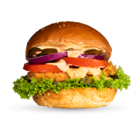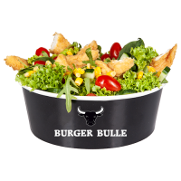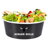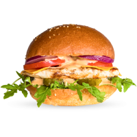mit gegrilltem Hähnchenbrustfilet, Cheddar, Rucola, Gurken, roten Zwiebeln und Bulls Specialsauce