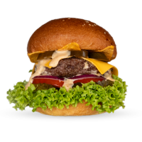 mit Cheddar, Gurken, Salat, roten Zwiebeln, Bulls Specialsauce und Cheesesauce