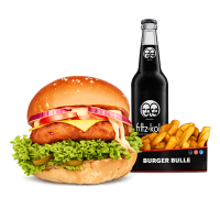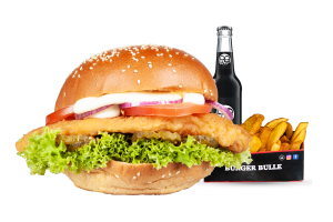 • 1 Crispy Chicken Burger • 1 Fries mit Dip nach Wahl • 1 alkoholfreies Getränk 0,33l nach Wahl inkl. Pfand