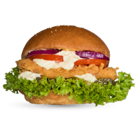 mit paniertem Hähnchenbrustfilet, Gurken, Salat, roten Zwiebeln, Jalapenos, Bulls Specialsauce und Salsasauce