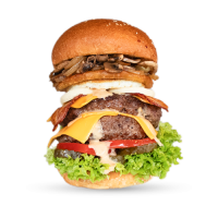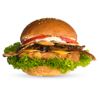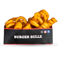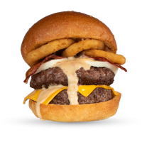 mit doppeltem Patty, Cheddar, Mozzarella, Onion Rings, Bacon, Bulls Specialsauce und Cheesesauce
