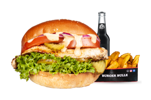 • 1 Grilled Chicken Burger (pikant) • 1 Fries mit Dip nach Wahl • 1 alkoholfreies Getränk 0,33l nach Wahl inkl. Pfand