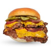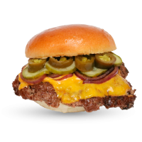 mit doppeltem Cheddar, doppeltem Patty, Gurken, Salat, roten Zwiebeln, Bulls Specialsauce und Cheesesauce