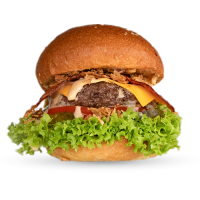 mit Cheddar, Bacon, Gurken, Salat, Röstzwiebeln, Barbecuesauce und Bulls Smokeysauce